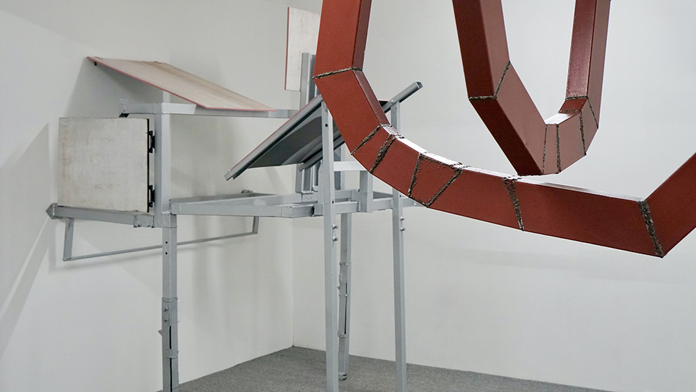 《RoomooR》에서 '룸(room)'은 철제 프레임이 경첩으로 연결되어 접히고 펼쳐질 수 있는 상태로 존재한다. 경첩은 골조를 잇는 동시에 움직임의 방향과 범위를 정하는 장치로 작동한다. 이러한 구조체는 다음 움직임이 개입되기 전까지 유지되는 잠정적 상태에 가깝다. 작가는 여러 모습으로 변신하는 구조를 넘나들며 무거움과 가벼움, 날카로움과 부드러움, 높이와 낮음을 온몸으로 감각한다. 자처럼 공간을 재고, 추처럼 균형을 가늠하며, 들어 올릴 수 있는 무게와 지나갈 수 있는 틈, 만질 수 있는 표면과 견딜 수 있는 강도를 시험한다. 이어지는 시험과 판단 속에서 '룸'은 몸의 개입으로 잠시 성립되고 허물어지기를 반복한다.