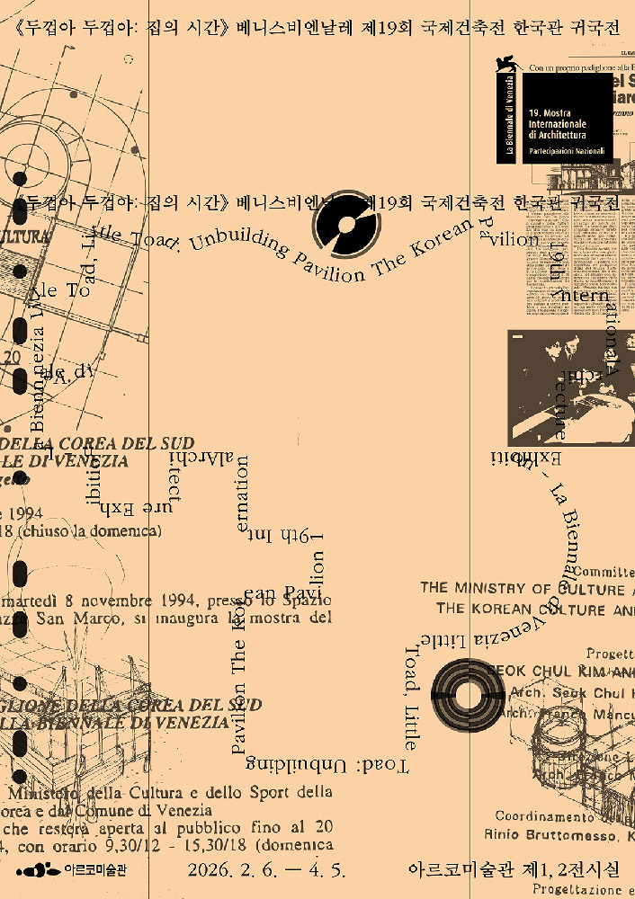 서울 아르코미술관에서 열리는 귀국전은 베니스 현지와 다른 조건 속에서 새롭게 구성되었다. 1층 전시는 한국관 건축 및 전시사 관련 자료와 이를 비평적으로 편집한 작업들로 구성되며, 연계 프로그램이 진행되는 공론장으로 역할한다. 2층 전시는 참여 작가가 한국관이라는 조건을 어떻게 해석하고 탈국가적 관점으로 확장했는지 살펴본다. 베니스에서 선보였던 장소특정적 설치 작업들은 귀국전에서 그 과정과 전략이 드러나는 방식으로 재구성되며, 관객은 다양한 해석과 실천의 경로를 따라 전시를 경험하게 된다.