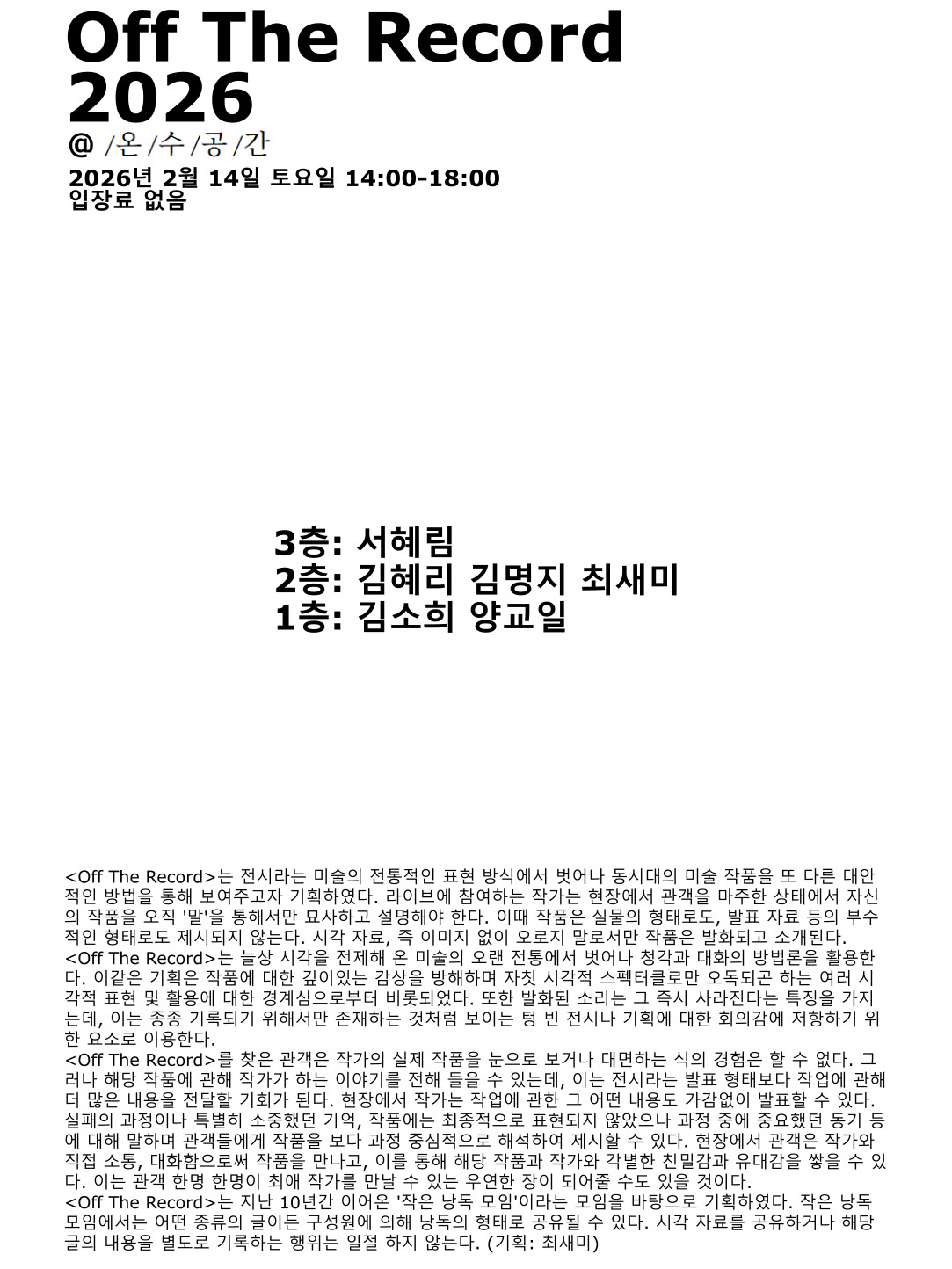 <Off The Record>는 지난 10년간 이어온 ‘작은 낭독 모임’이라는 모임을 바탕으로 기획하였다. 작은 낭독 모임에서는 어떤 종류의 글이든 구성원에 의해 낭독의 형태로 공유될 수 있다. 시각 자료를 공유하거나 해당 글의 내용을 별도로 기록하는 행위는 일절 하지 않는다. (글: 최새미)